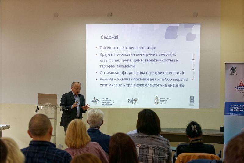 On Thursday, September 19, a presentation of the Manual for the Procurement of Electricity and Optimisation of Electricity Costs in Public Buildings and Institutions in Serbia was delivered on the premises of the Energy Efficiency Centre of the Faculty of Mechanical Engineering. The manual has been prepared within the project "Removing Barriers to Promote and Support Energy Management Systems in Municipalities throughout Serbia". This presentation is only one in a series of technical workshops that UNDP and the Standing Conference of Towns and Municipalities, with the support of the Ministry of Mining and Energy regularly organise for members of the Network. The aim of the workshop was to familiarise energy managers and municipal officials with the process of public procurement of electricity and the possibilities to reduce electricity costs in public buildings in their competence. Participants received information on the most important energy and cost efficiency measures in the electricity system with guidelines for their application. The training was delivered by Slobodan Ruzic, PhD, the author of the manual and our well-known expert in this field of expertise.