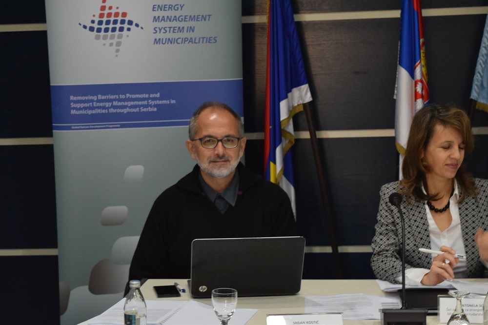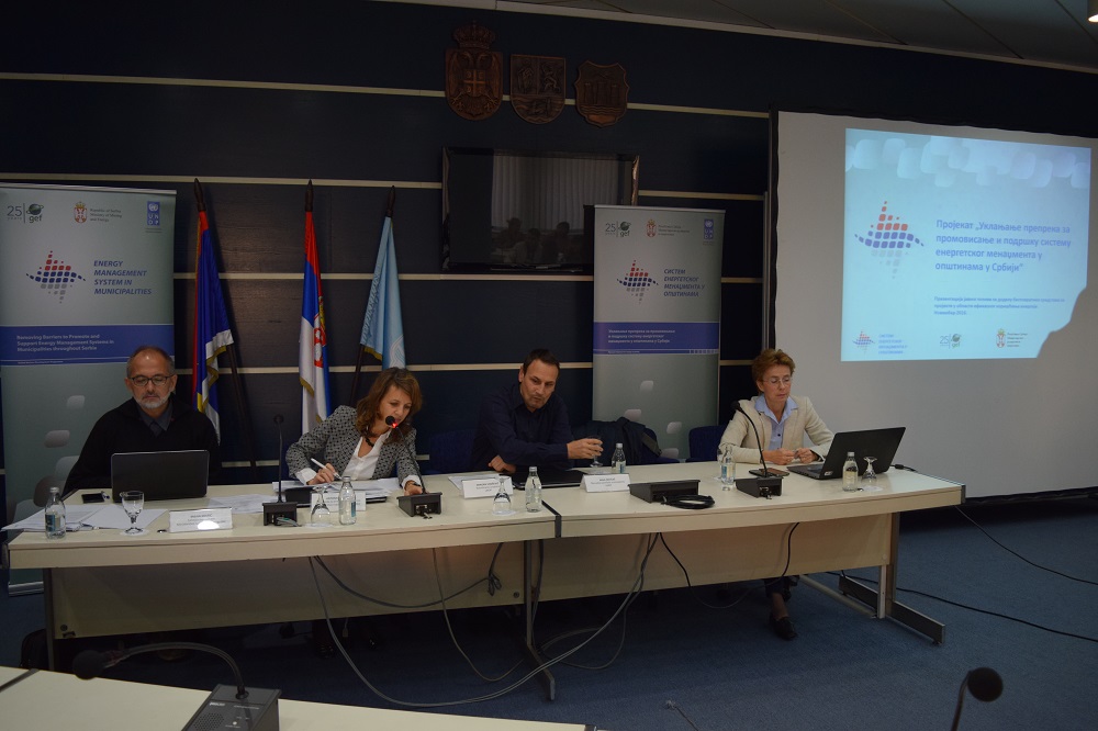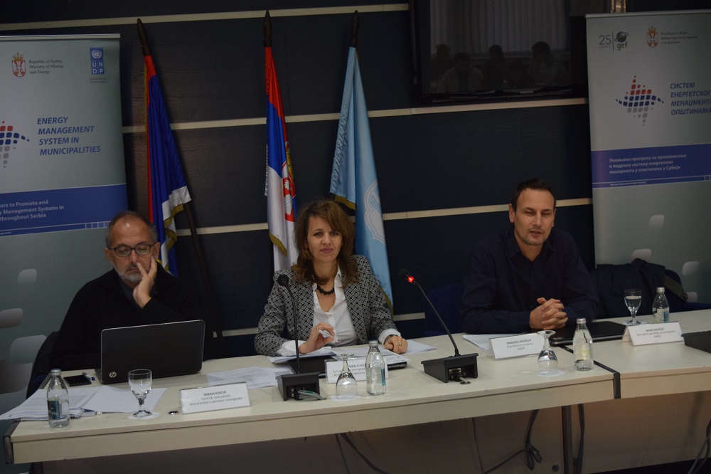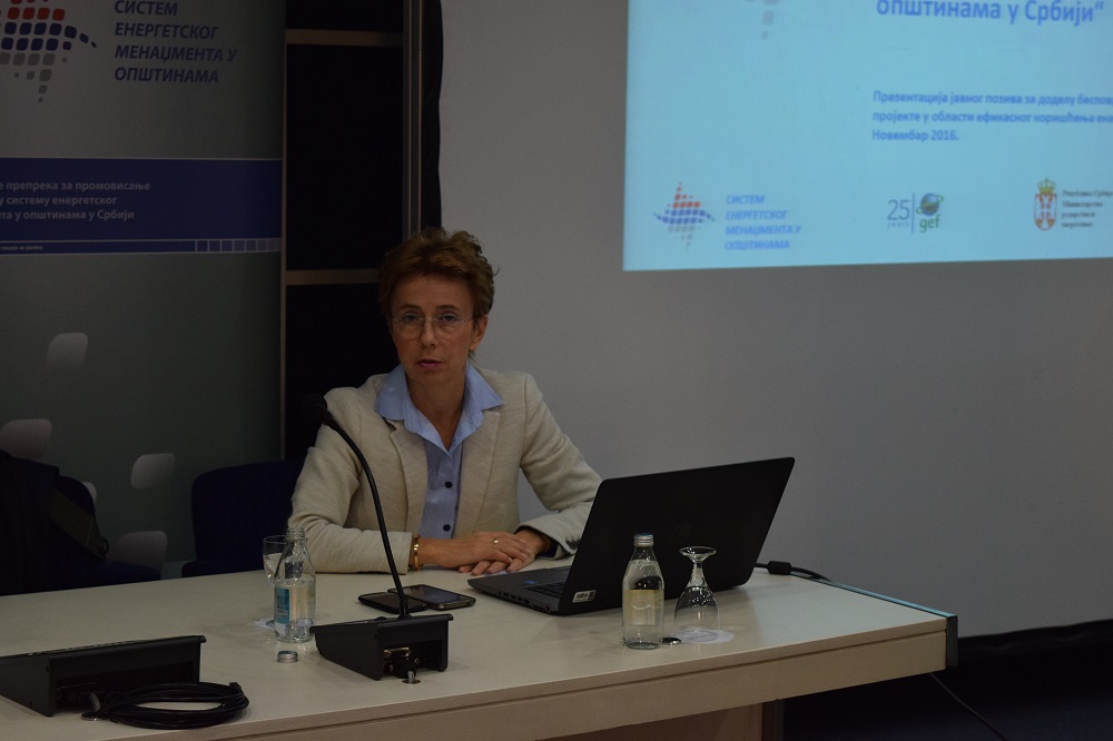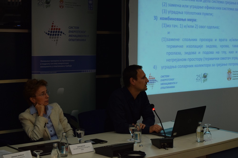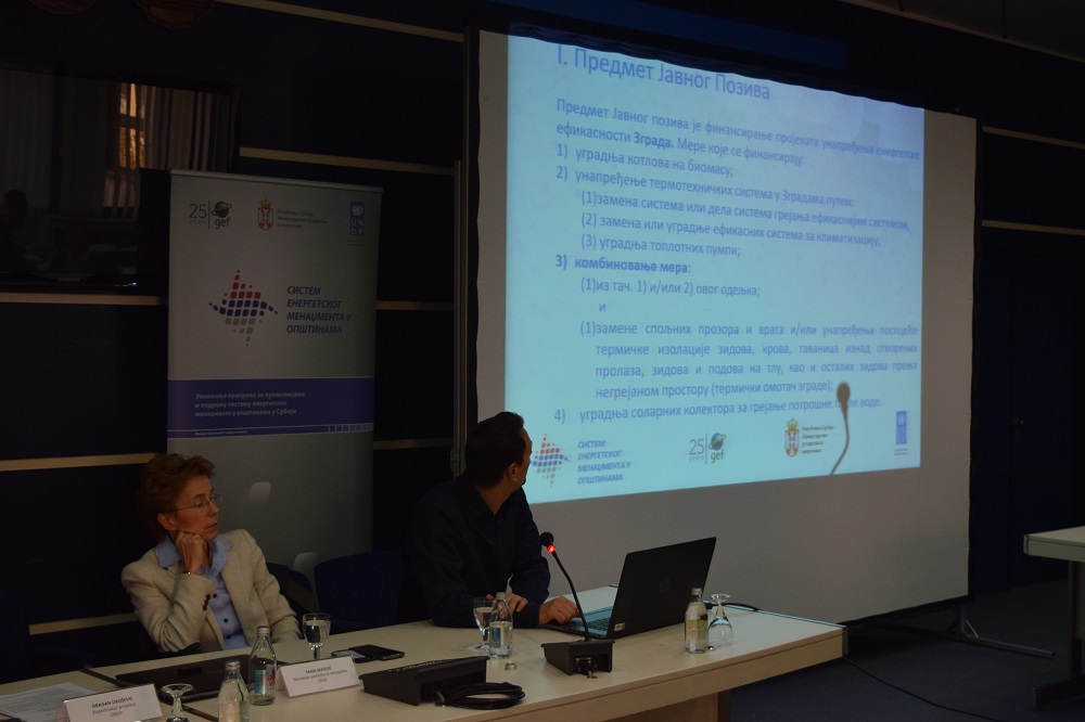 Pozdravnu reč prisutnima uputila je Antonela Solujić, šef grupe za energetsku efikasnost u Ministarstvu rudarstva i energetike koja je tom prilikom podsetila prisutne da je od aprila 2015. godine počelo operativno uvođenje sistema energetskog menadžmenta u opštinama kao i na obavezu opština da dostavljaju podatke u vezi sa realizacijom Nacionalnog akcionog plana za energetsku efikasnost. Nakon toga Maja Matejić, portfolio menadžer za energetiku UNDP i menadžer projekta „Uklanjanje prepreka za promovisanje i podršku sistemu energetskog menadžmenta u opštinama u Srbiji” upoznala je prisutne sa projektom koji predvodi a zatim je Dragan Urošević, koordinator projekta, predstavio detalje javnog poziva. Njima se u prezentaciji konkursa i njegovih detalja, ali i u odgovorima na brojna pitanja zainteresovanih predstavnika lokalnih samouprava, pridružio Srđan Kostić, savetnik Ministarstva rudarstva energetike Republike Srbije koje realizuje poziv.