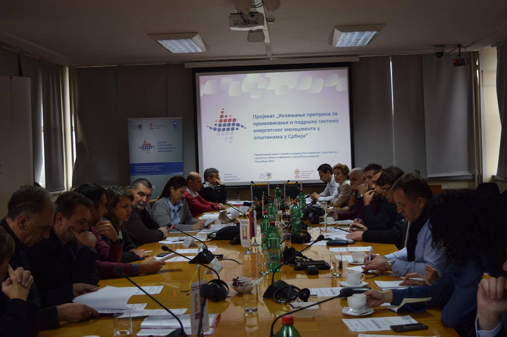 U utorak, 8. novembra 2016. godine u prostorijama Stalne konferencije gradova i opština Srbije održana je četvrta u nizu prezentacija Javnog poziva za dodelu bespovratnih sredstava za finansiranje projekata u oblasti efikasnog korišćenja energije u jedinicama lokalne samouprave. U sali punoj zainteresovanih predstavnika lokalnih samouprava iz opština i okruga koji gravitiraju Beogradu kao i njihovih javno komunalnih preduzeća predstavnici Programa Ujedinjenih nacija za razvoj (UNDP) i Ministarstva rudarstva energetike Republike Srbije predstavili su Projekat u okviru koga se realizuje javni poziv, a zatim i sam poziv.