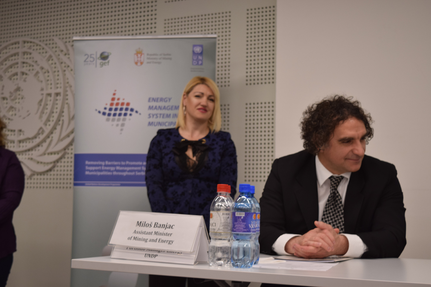 Pomoćnik ministra energetike i nacionalni direktor projekta „Uklanjanje prepreka za promovisanje i podršku sistemu energetskog menadžmenta u opštinama u Srbiji” gospodin Miloš Banjac prikazao je dosadašnje rezultate projekta, objasnio svrhu uvođenja sistema energetskog menadžmenta u lokalnim samoupravama kao i detalje projekata za čije kofinansiranje su potpisani ugovori. U svom izlaganju je naglasio da su u saradnji sa UNDP realizovane obuke i ispiti za energetske menadžere u lokalnim samoupravama i zgradama, kao i da lokalne samouprave jedna po jedna imenuju licencirane energetske menadžere i da se očekuje da se ovaj trend ubrza ove godine. Takođe, istakao je važnost demonstracionih projekata koji će se realizovati nakon potpisivanja ugovora, čime će se obezbediti ušteda emisije CO2 od oko 1500 tona godišnje. Posebno je naglasio da su sredstva odobrena za čak 6 projekata prelaska na grejanje na biomasu čime se kapacitet ovakvih postrojenja u Srbiji podiže za dodatnih 2.5 MW.